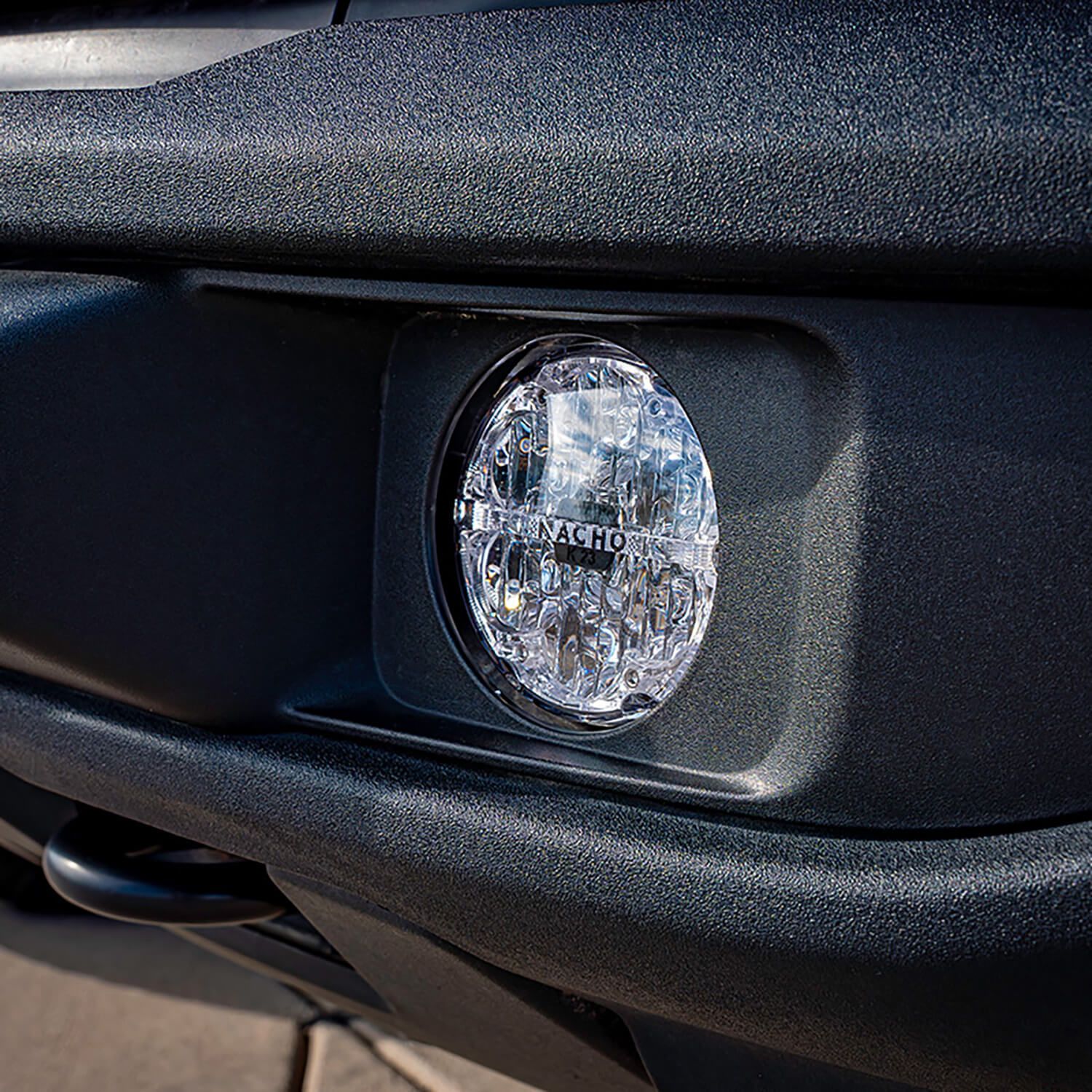 The NACHO Plug N Play Kit is exactly that. This kit comes with everything needed to swap out your stock fog lights in your Bronco single-piece plastic bumper and bring style and more usable output to your fog lights. The kit consists of 2 Quatro SAE Amber lens lights, 2 mounting brackets, and OEM connectors for the lights to plug directly into the factory fog light plug. This makes for a quick and easy swap while maintaining the factory switching and the piece of mind. The Quatro SAE is still equipped with our TRL or Trail Running Light and includes a light connector and fuse tap harness to power the TRL to your auxiliary power.